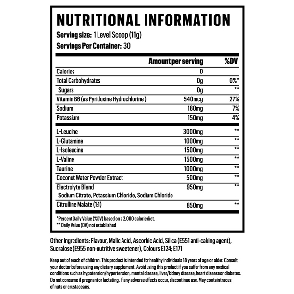 Mix 1 scoop with 300–400ml cold water. Use during training or throughout the day for recovery support.